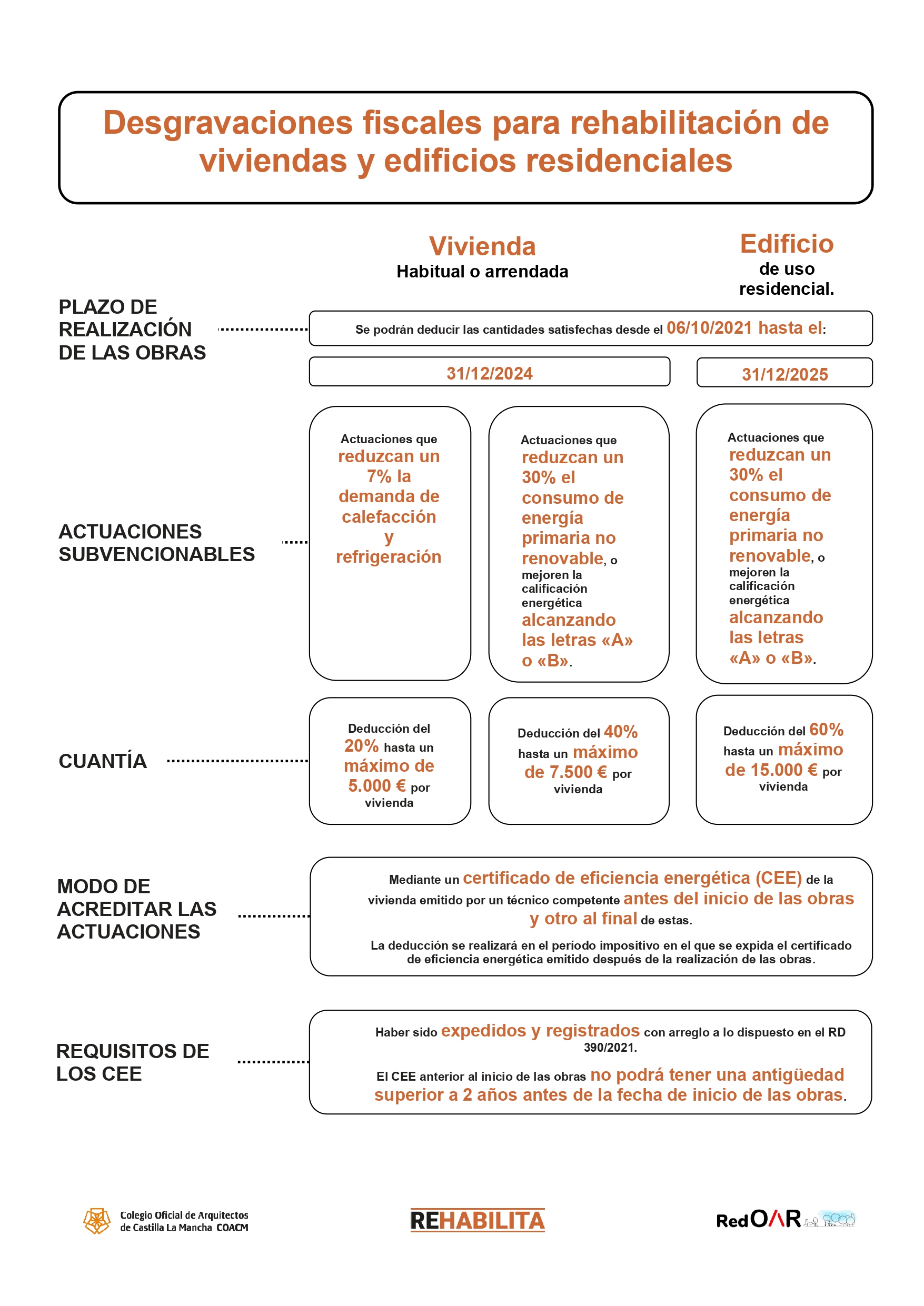 El Real Decreto-Ley 19/2021, de 5 de octubre, de medidas urgentes para impulsar la actividad de rehabilitación edificatoria, refuerza la capacidad de las comunidades de propietarios para llevar a cabo obras y actuaciones que mejoren la eficiencia energética, rebajando a mayoría simple el respaldo necesario en las comunidades de propietarios para aprobar las actuaciones de rehabilitación y solicitar financiación y ayudas públicas. También se ha reforzado la capacidad de actuación de dichas comunidades para el acceso al crédito y así favorecer su capacidad de financiación. Se introducen nuevas deducciones por obras en vivienda habitual y en edificios residenciales, en la cuota del Impuesto sobre la Renta de las Personas Físicas (IRPF).